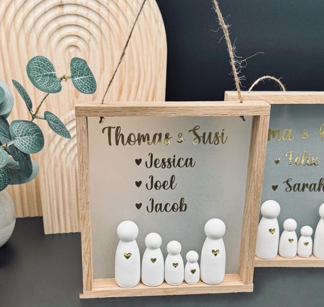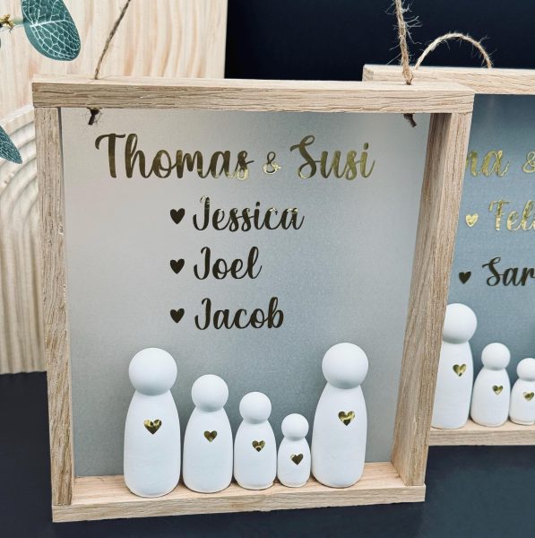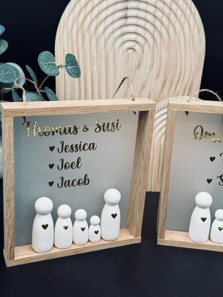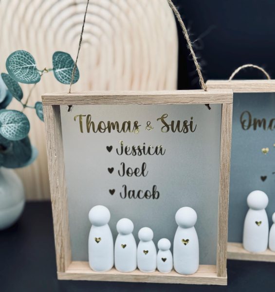Holzrahmen mit personalisiertem Hintergrund. Familienfiguren verziert mit einem Herz. Mit Schnur zum Aufhängen.