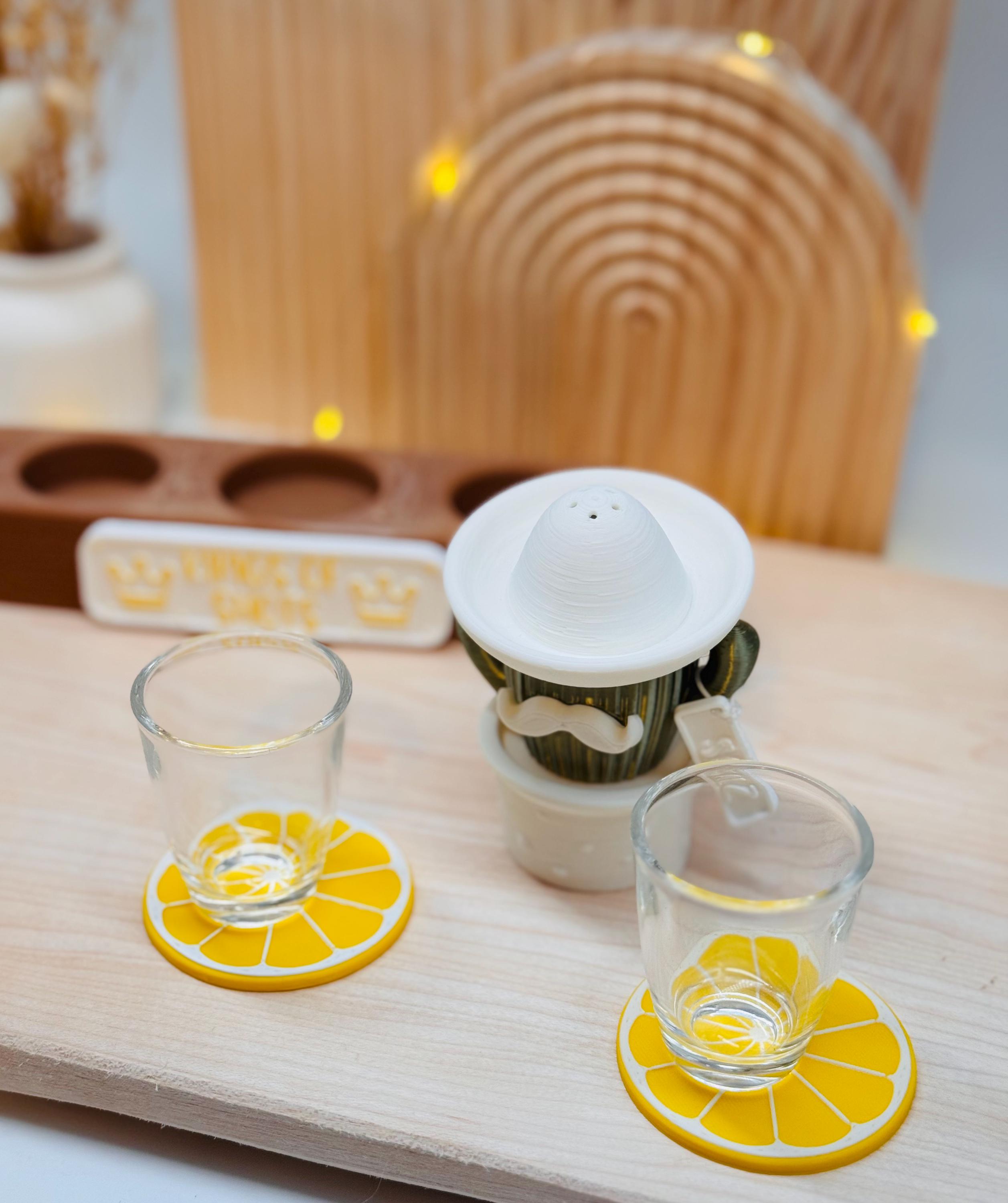 Maße ca: Breite: 27 cm Höhe : Schnapslatte 3 cm (mit Salzstreuer ca. 11 cm) Tiefe: 5 cm Untersetzer: Ø 5,5 cm Füllmenge Schnapsgläser 30 ml