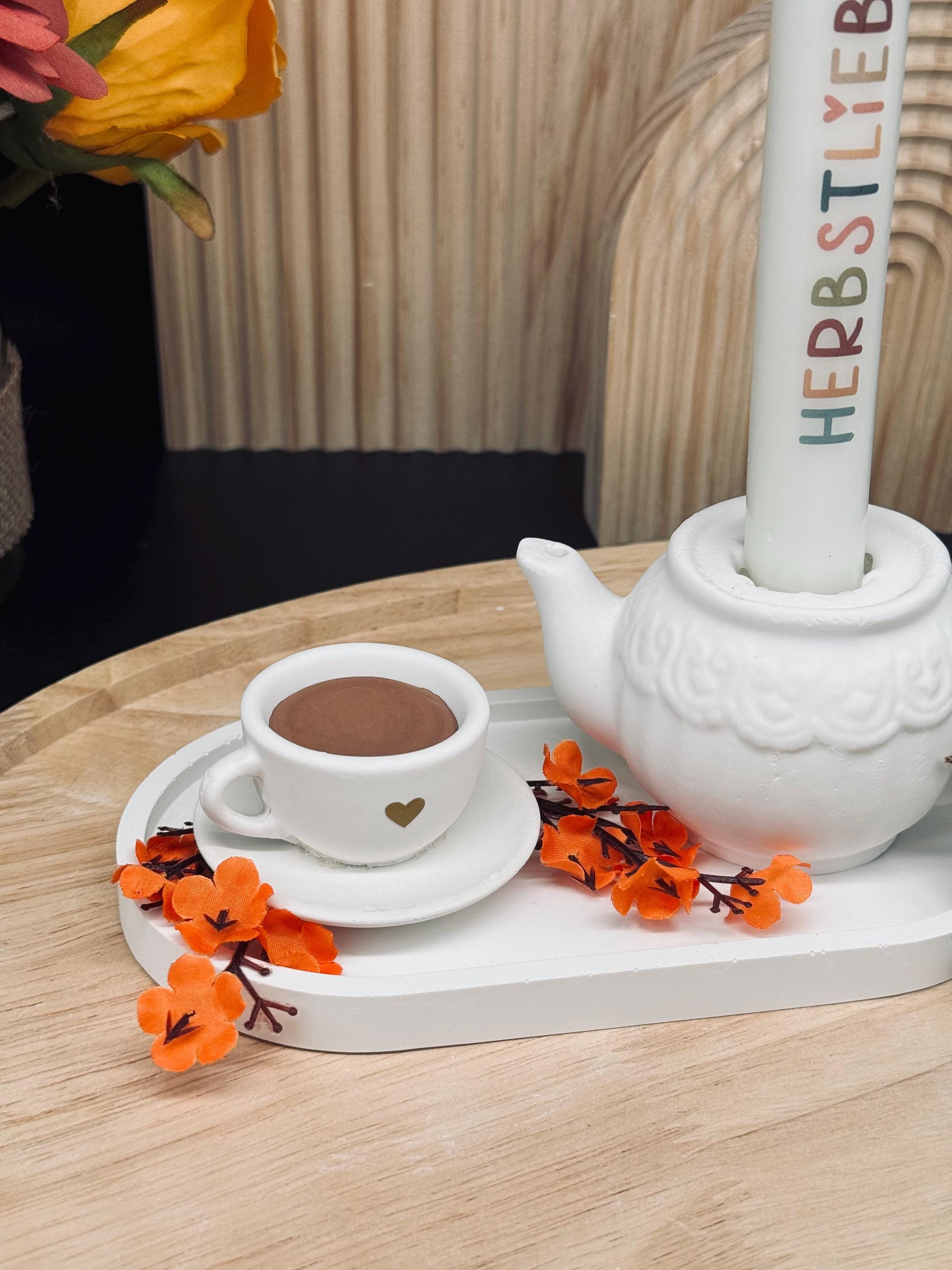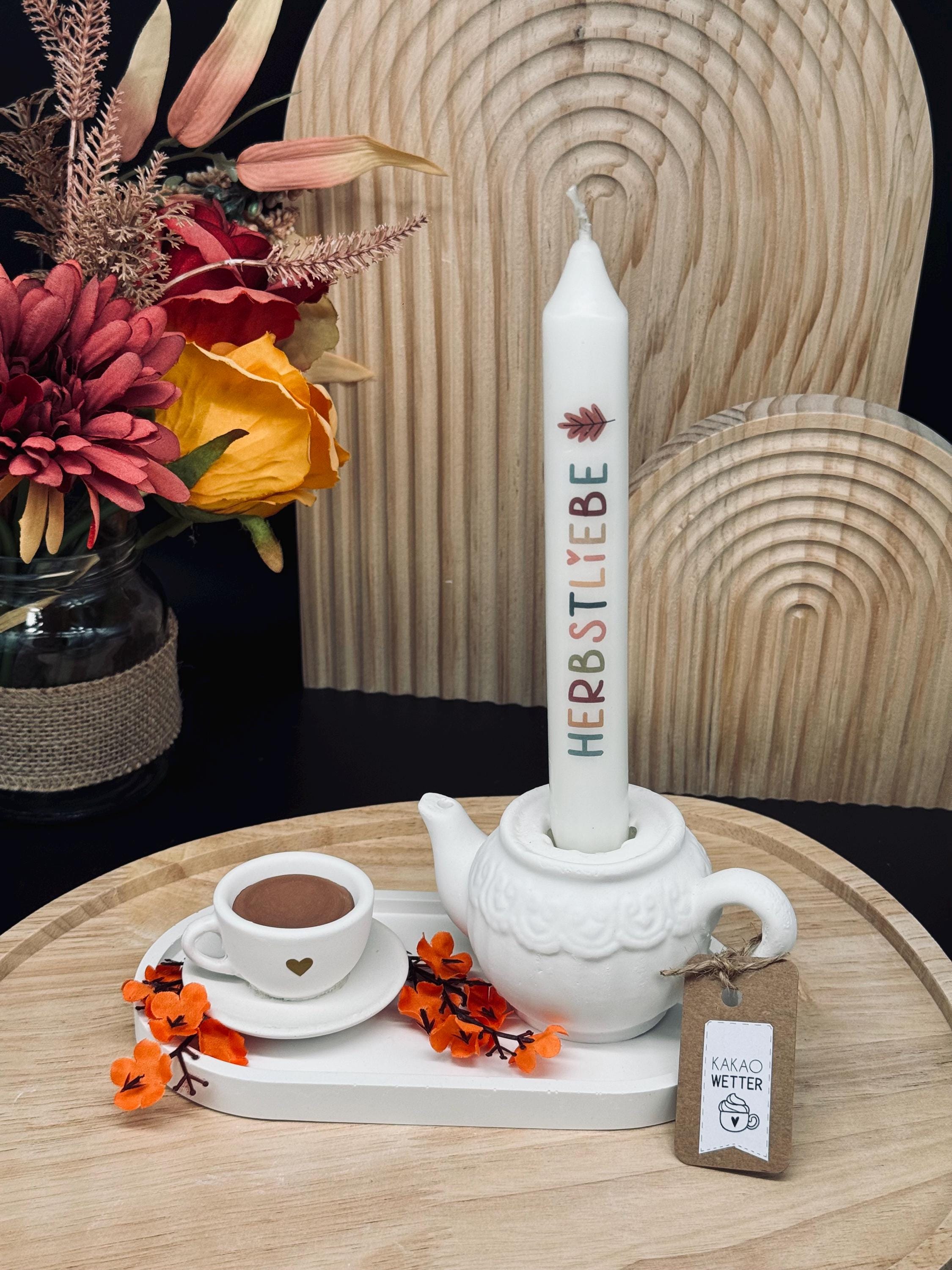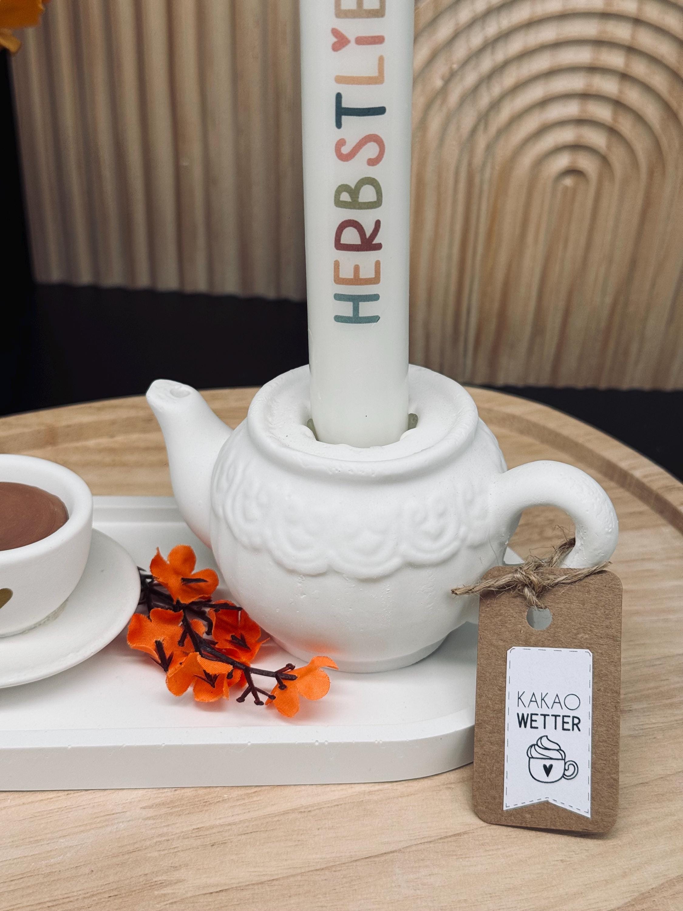 🤍 ☕️ Herbstdeko | Kanne mit Tasse | Teekannen-Kerzenhalter | Deko-Tablett | Herbstdekotablett ☕️ 🤍