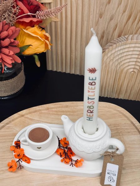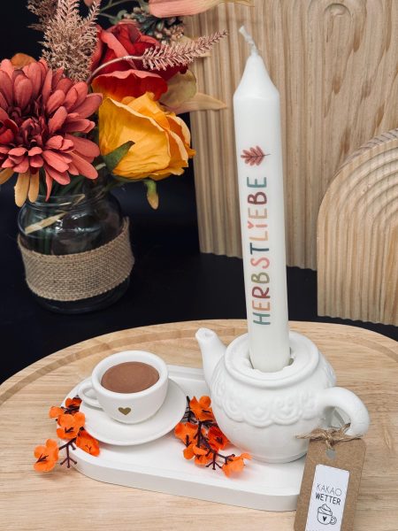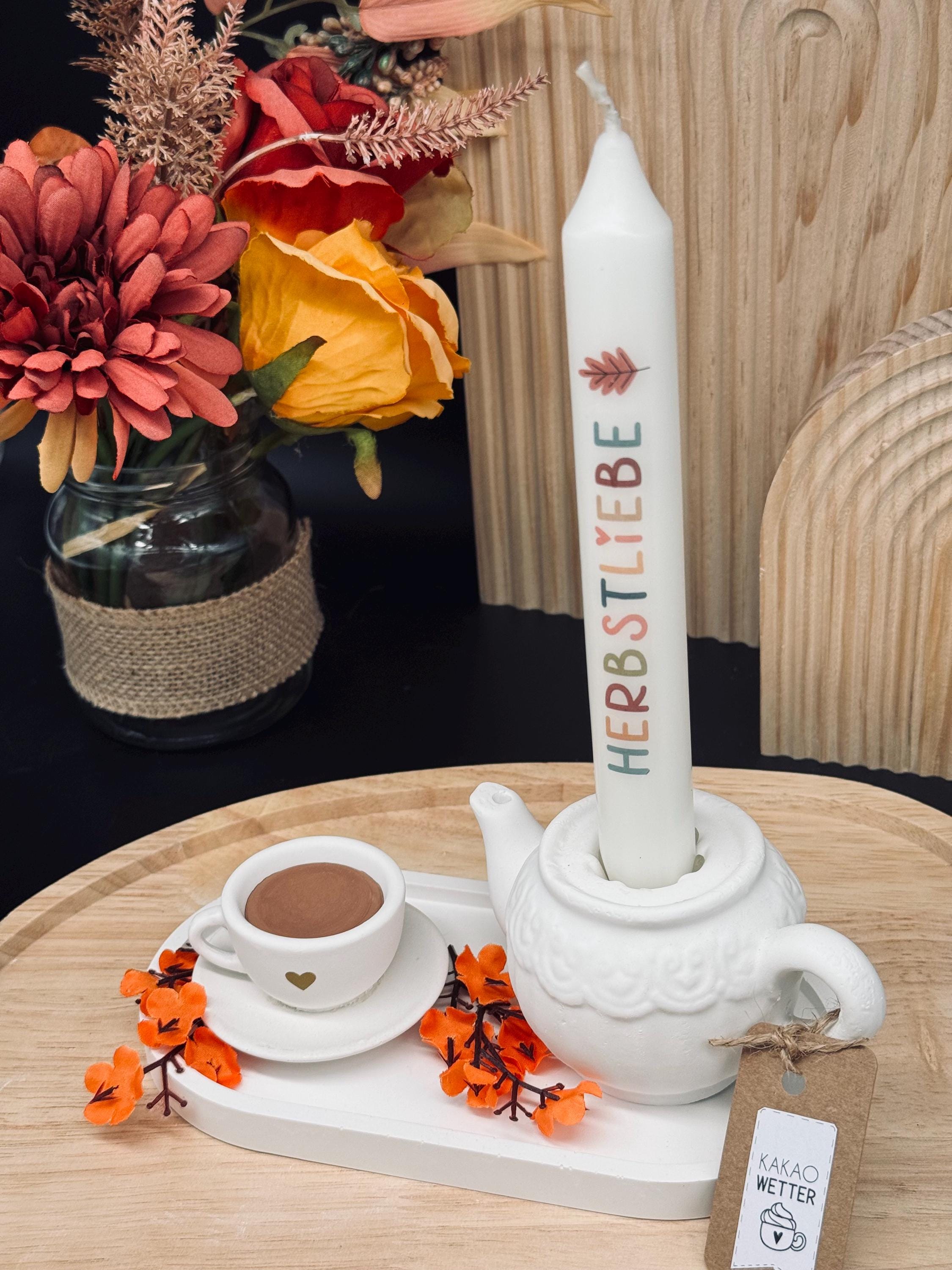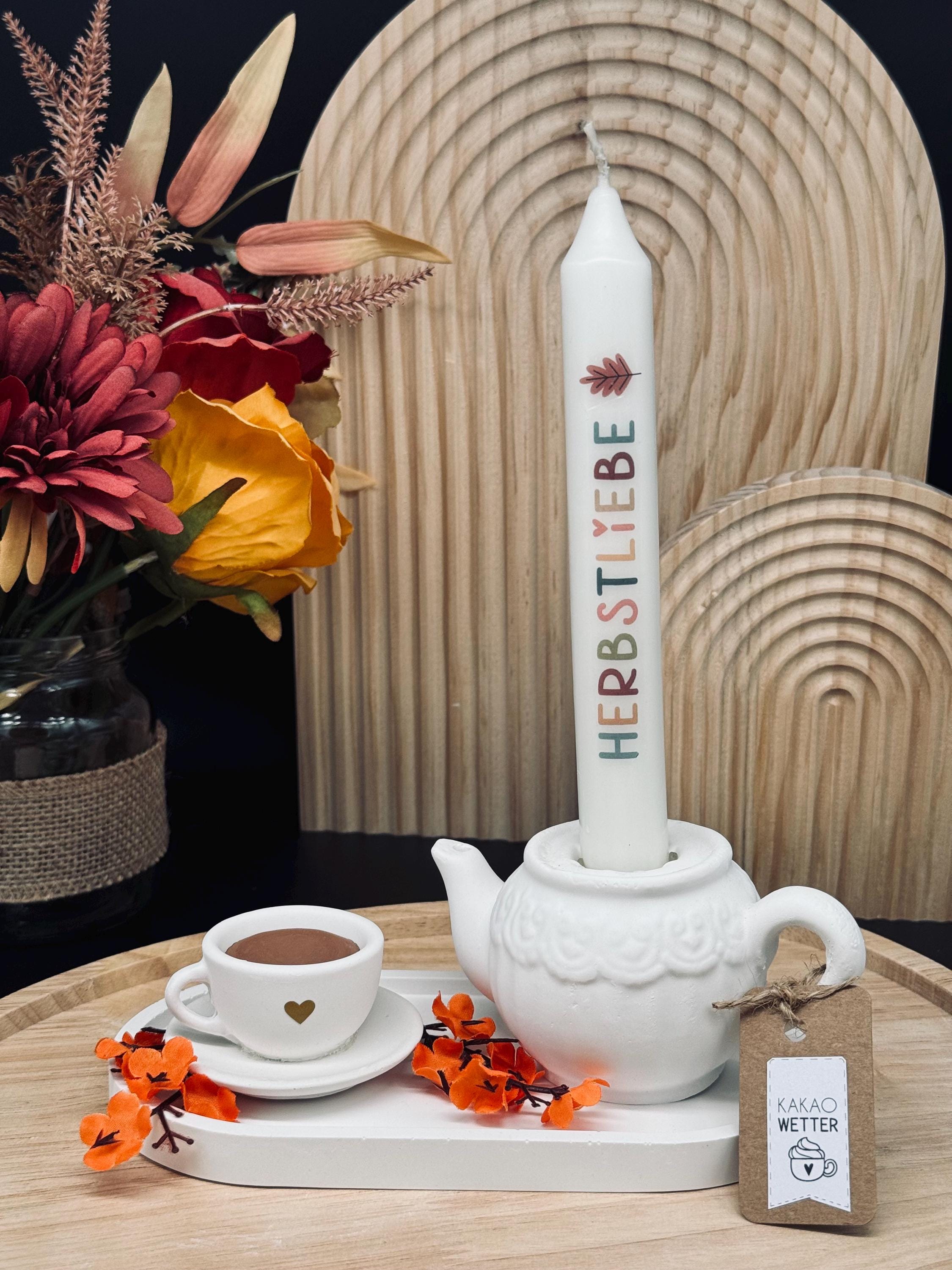 🤍 ☕️ Herbstdeko | Kanne mit Tasse | Teekannen-Kerzenhalter | Deko-Tablett | Herbstdekotablett ☕️ 🤍