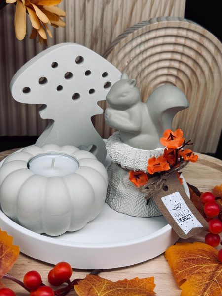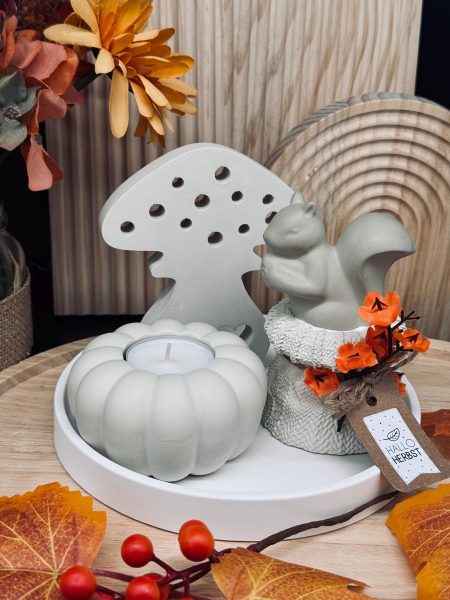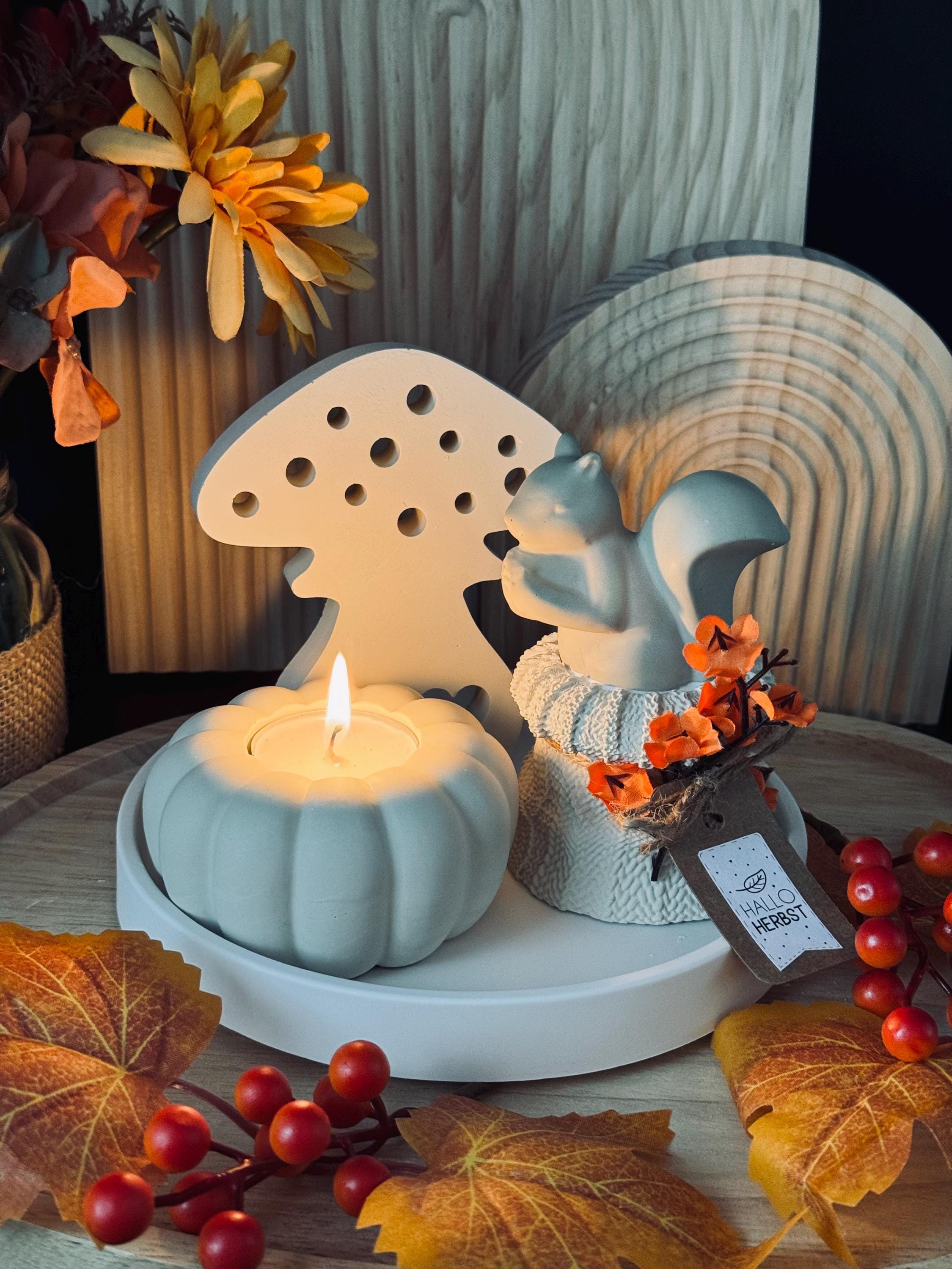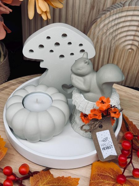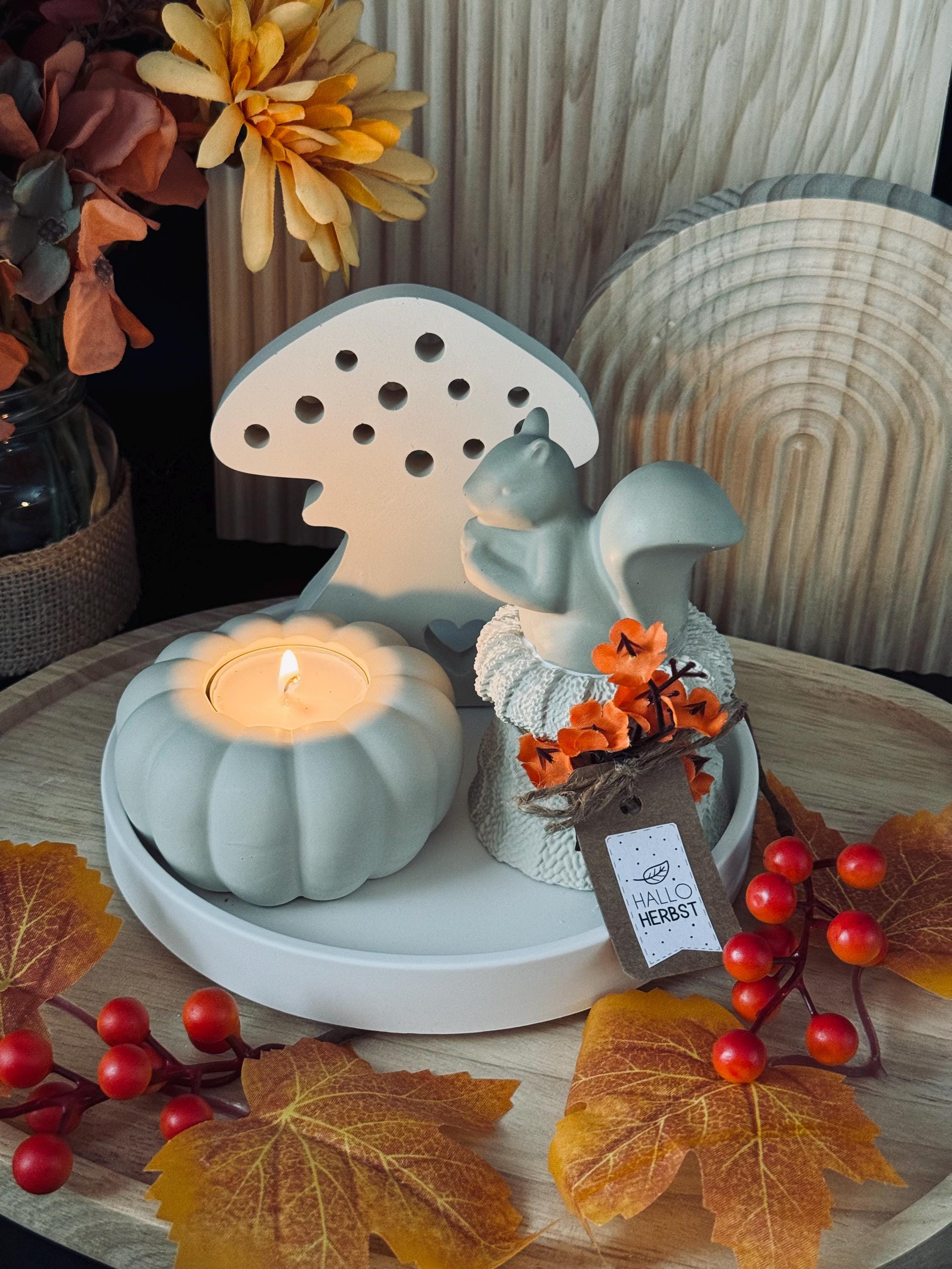Dekotablett mit süßem Eichhörnchen , Kürbisteelicht und kleinem Pilz.