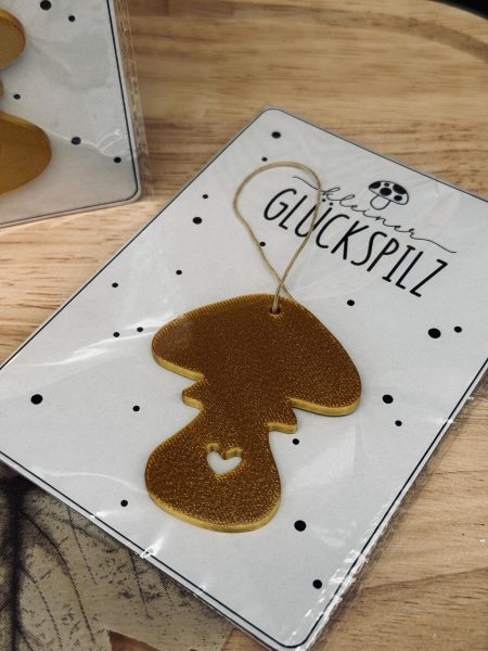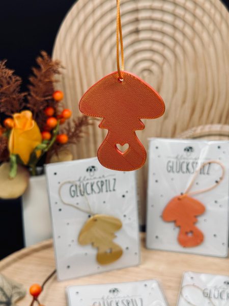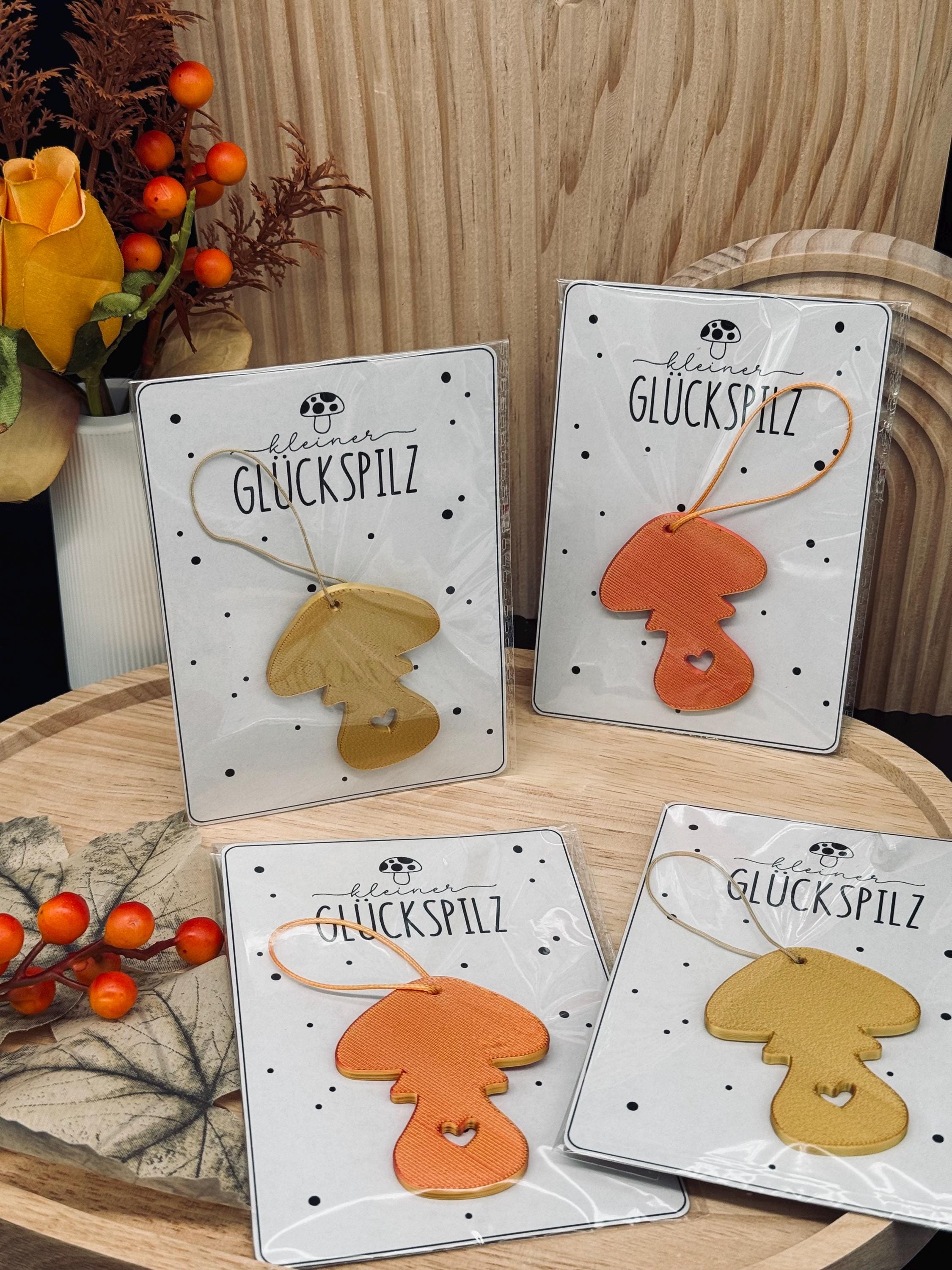 Pilzanhänger (Material: PLA) auf einer Glückspilzkarte. Verpackt