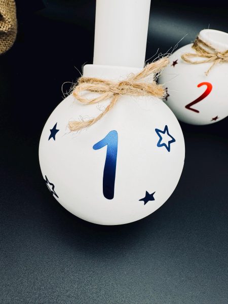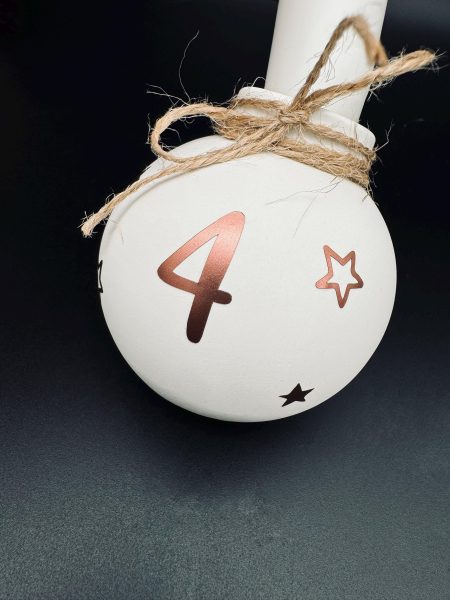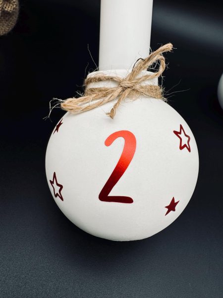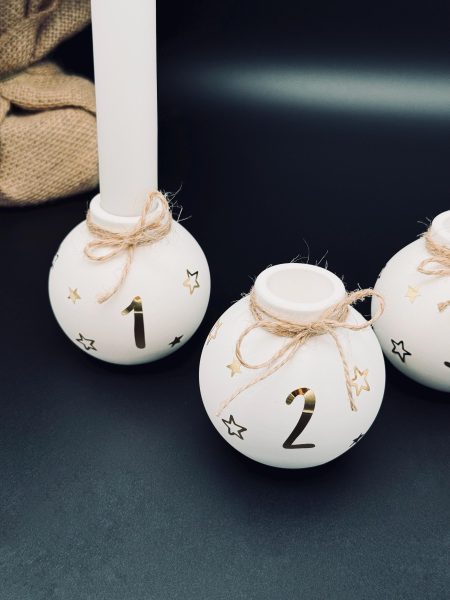 Lieferumfang: 4 Weihnachtskugeln Kerzenhalter mit den Zahlen 1 - 4 dekoriert mit Juteschnur. Kerzen sind im Lieferumfang nicht enthalten.